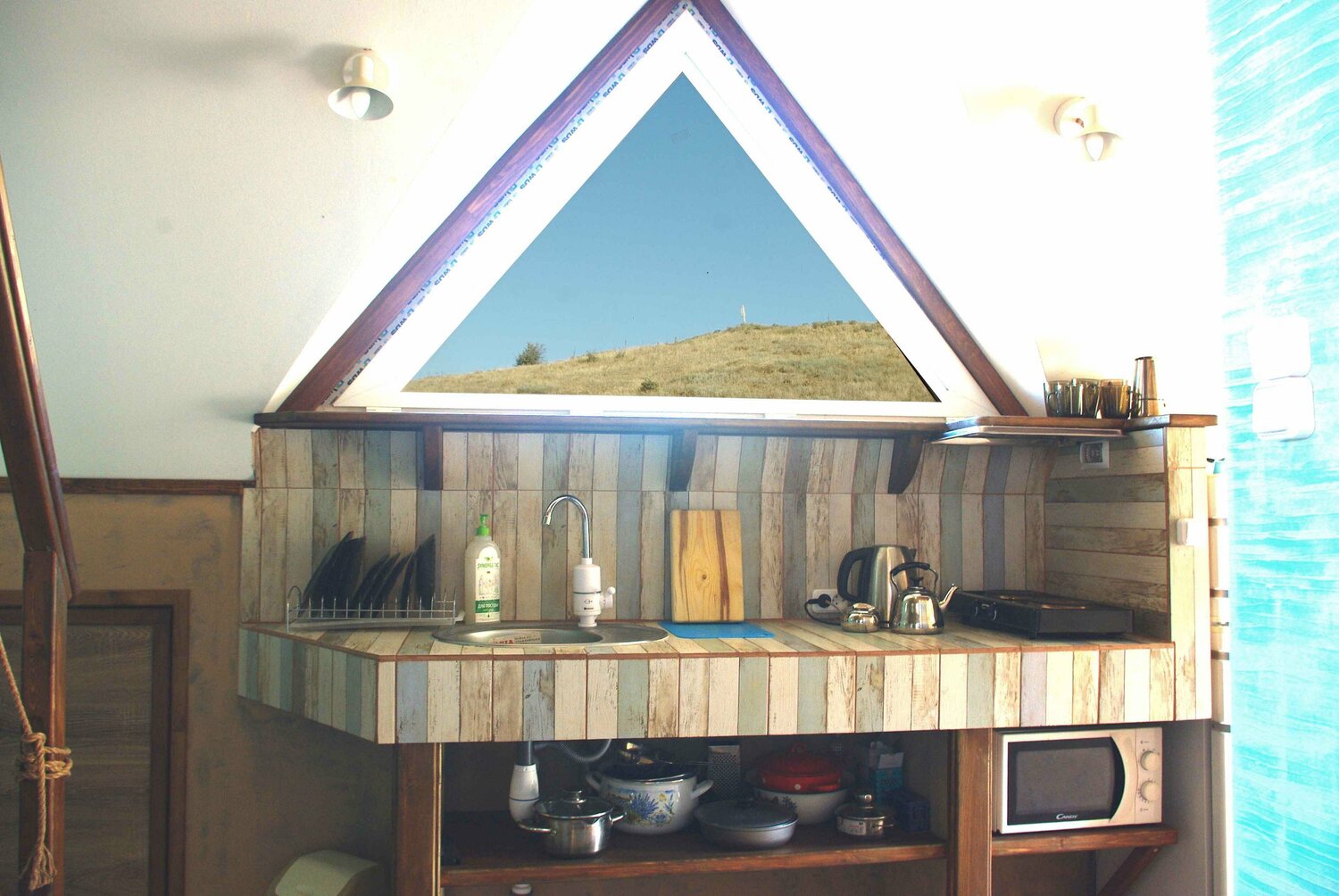 - мини-кухня со всей утварью (в т.ч. кофеварка, электрический и заварочный чайники), печь свч, холодильник;